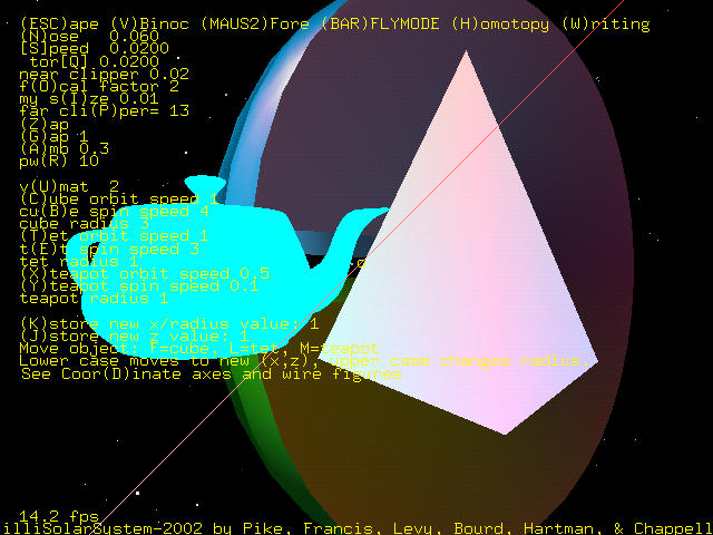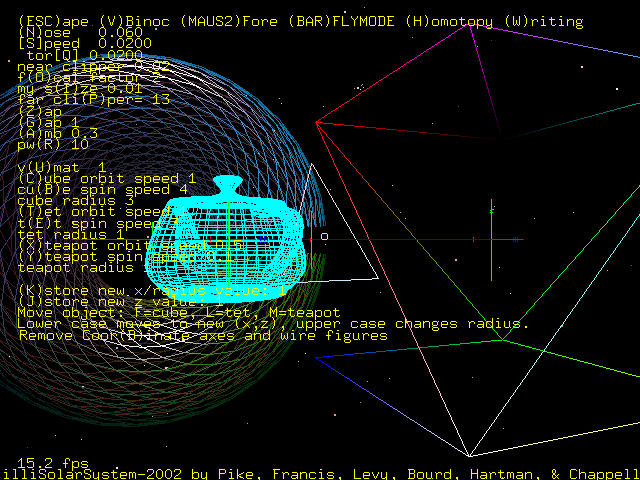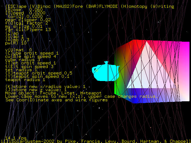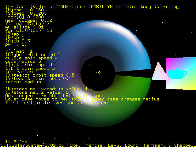 The user of the program is allowed to view the arrangement of objects through the affine matrix and also through each of the objects. To view through the torus, cube, or tet, the matrix corresponding to the object is inverted. To view through the teapot, the teapot matrix and cube matrix are multiplied, and then the inverse of the product is taken.