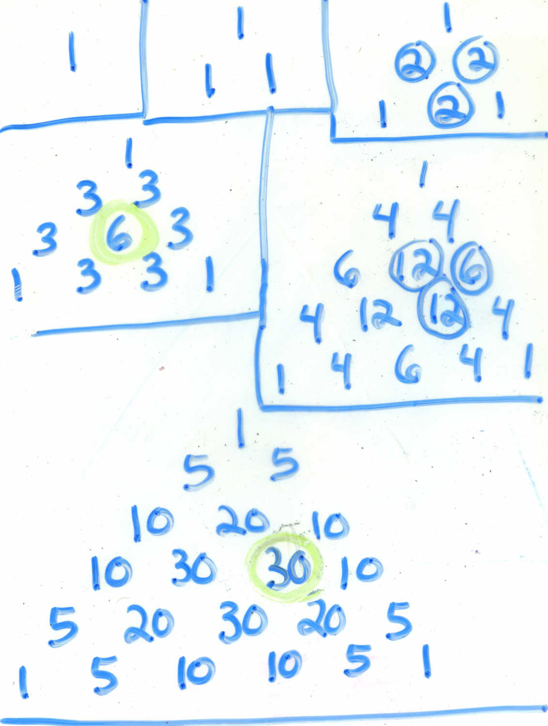 In this picture, the green number is the sum of three blue numbers