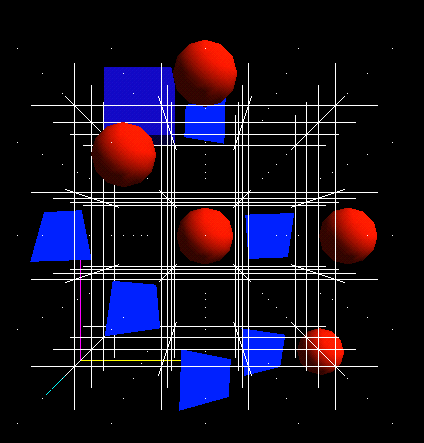 The program uses a pseudo-4-dimensional approach to display the 3-dimensional projection of the hypercube grid on which the game is played. Using a combination of mouse and keyboard, the user will has control over translation and rotation in all 4 dimensions. The keyboard is used to input the player's moves by moving to the desired square among 4 dimensions. The hypercube is approximated by a series of five cubes, each with a different w (4th dimensional) coordinate. The user is able to determine how this w coordinate is projected onto three space.