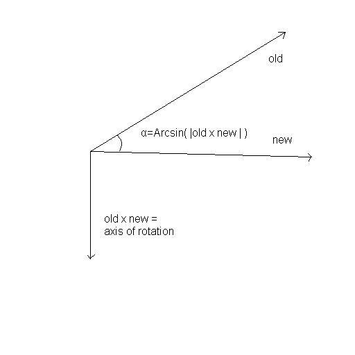 Applying the Bishop frame to our spline is rather straightforward. We keep track of our current frame in an OpenGL style 4x4 matrix, and then apply and accumulate rotations to the matrix each frame. To apply our rotations, we need to know both the axis of our rotation, and the angle that we need to rotate about that axis. To calculate the axis of rotation, we simply need to take the cross product of our old direction vector, and our new (direction vector). Then, to calculate the angle of the rotation, we just need to take the inverse sine (arcsin) of the magnitude of the cross product of the old direction vector and the new direction vector (I make sure they are unit vectors). See the figure below for more details.