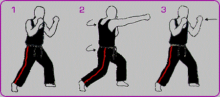 The following picture outlines the basic steps and movements of a proper reverse punch: