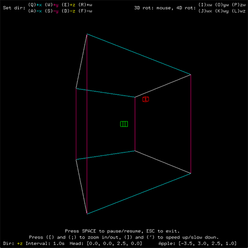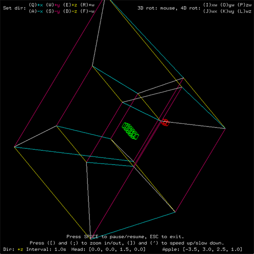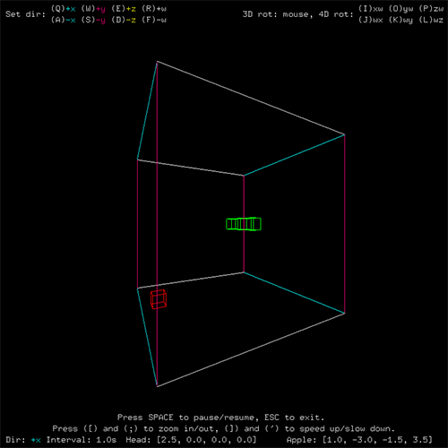 There it is! However, what we thought was a simple cube was actually a tesseract, or a four-dimensional hypercube, the four-dimensional analog of a cube. Each body element of the snake and the apple are also hypercubes. Telling the snake to go in a certain direction may cause it instead to start becoming larger or smaller. Try using 4D rotations to straighten it out. Also, notice how the axes that are not in the rotating plane maintain their orientation. We are used to seeing only one axis fixed when an object rotates in three dimensions. Now, two axes are fixed. The important thing to understand is that we are not actually seeing a four-dimensional wireframe, merely its three-dimensional shadow caused by a "flashlight" that I have set at position w = 10 pointing in the negative w direction. For more commentary about the nature of simple four-dimensional geometry, please refer to the documentation. The following is an animation of HyperSnake in action.
