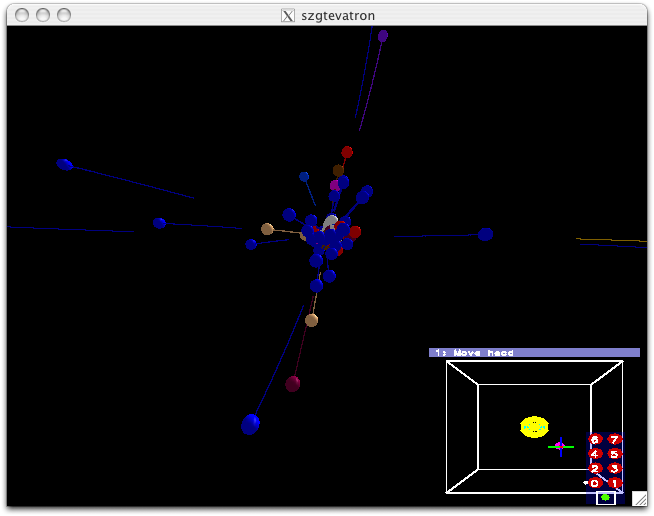 The src files are in this directory, just add szgtevatron.zip to the current url. After unpacking, the readme has useful information concerning compiling. During runtime, (NOTE: this version must run in standalone mode...updates to come) you must choose one of the nine events depicting Higgs boson and W boson generation. Currently, the zapping function does not work. I recommend mode 5 and pressing the spacebar. Then pressing the middle and right buttons will toggle and reset the particle trials. Concerning the colors, white ones are gammas, blue is a pion, a type of meson and red is a kaon, another type of meson. Most particles resulting from the collision are of these types.
