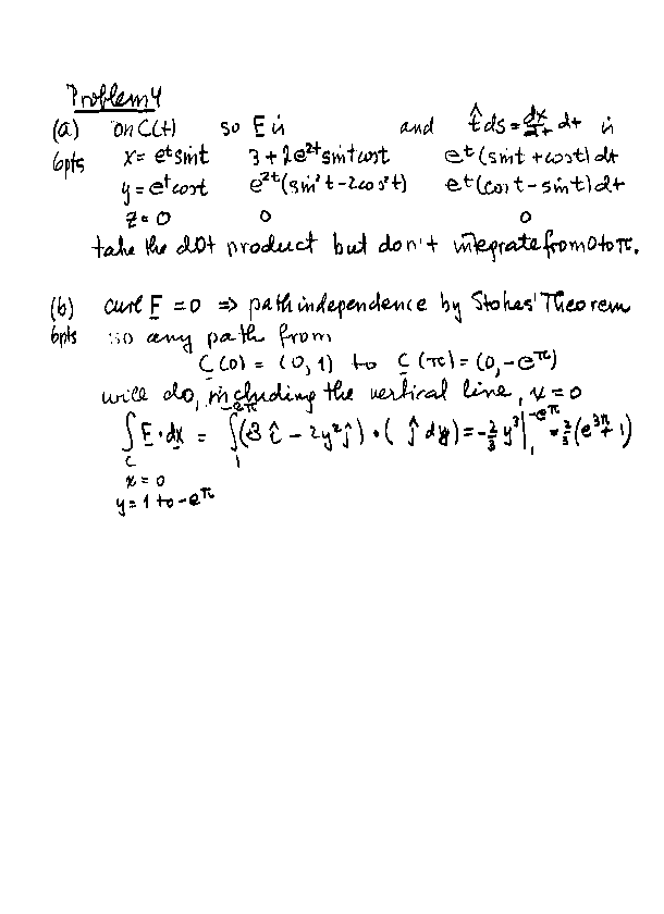I discussed the solutions to problems 2 and 3 on Monday, 16mar98. For Problem 2a, 3pts went for a correct formula, the other 3 for adequate documentation. For 2b I accepted any example where the Theorem really did make things easier to calculate. So a description of some application of the Theorem was not enough to gain full 6 points.