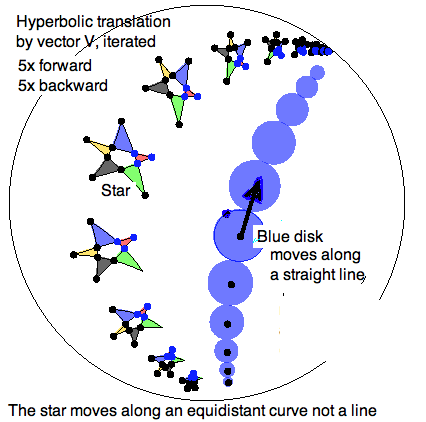 Question 1.Find the equation of the hyperbolic line joining $z_1= \frac{1}{2}, z_2 = \frac{1}{2} i $. This proves that Euclid's first postulate holds in the Poincare model of non-Euclidean geometry. \subsection{Comment} Which of these two proofs do you find the easier to understand and remember? It might depend on whether you feel more comfortable with traditional geometry, and want to avoid using complex numbers. But in this course you need to exercise your complex number geometry because the traditional geometric proofs become increasingly more difficult and cumbersome. Maybe that is why, historically, it took over two thousand years to discover non-Euclidean geometry. \section{Verifying the remaining postulates} We shall not verify the other postulates of Euclid. We already know they are not adequate even for absolute geometry. In a different edition of this course, it would be appropriate to state a complete set of axioms, similar to Birkhoff's four axioms for Euclidean geometry. See, for example, an excellent discussion of this issue in Appendix C of Gerard Venema, "The Foundations of Geometry", Prentic-Hall 2005. In the previous lesson we discussed the non-Euclidean Ruler Axiom in the Poincare model. The negation of Playfair is built into this model from the beginning. A nice project for you, after you have finished this course, is to locate some other propositions from absolute geometry and verify them in the Poincare model. For example, Circles turn out to be circles, but their Centers are not in at their center. Note that, contrary to Microsoft philosophy, capitalization can matter. \section{Transitivity of the Hyperbolic Group} One of the constant assumption Euclid makes is that there is a congruence which takes a given point to another given point. This is called \textit{ motion transitivity} and a translation is the easiest (though not the only) solution of finding a hyperbolic isometry which moves one figure to another. [Compare Hvidsten, Exercise 8.2.9] Recall that one canonical form of elements in the hyperbolic group is given by \[ V_{\theta, \alpha}(z)= e^{i\theta}V_\alpha(z) = e^{i\theta}\frac{z-\alpha}{\bar{\alpha}z -1}. \] To show that one of these exists taking given a point $p$ to another given point $q$, we might be tempted to solve the complex equation \[ V_{\theta,\alpha}(z_1) = z_2, \] for the unknowns $\theta, \alpha$. Which, when the smoke clears, becomes two equations of real numbers in 3 unknowns. But a clever argument proves that such a solution exist without actually computing the solution. We know that $V_\alpha(\alpha) =0 $. So the composition: $f(z) := V_q^{-1}(V_p(p)) $ takes $ p \mapsto 0 \mapsto q $. Since a group is closed under inverses and composition and every element has this cononical form, we're done. Recall that these MTs are involutions, so we can drop the exponent on the second involution. You will appreciate the elegance of this argument if you actually do the following two, now redundant, exercises.Question 2.Given a MT $f(z) = \frac{az+b}{\bar{b}z+\bar{a}}$, find its canonical form. Hint: Manipulate the fraction algebraically until it is in the proper form. In particular, you should discover that $\alpha = -b/a$ and $\theta = arg(-a/\bar{a})$.Question 3.Calculate the canonical form of the composition $V_q \circ V_p $. Hint: Substitution yields a MT of the form $\frac{az+b}{\bar{b}z+\bar{a}}$ should determine what $a,b$ are in terms of $p,q$. Then you can apply the result of the previous calculation. \section{The hyperbolic translations} There is another sort of hyperbolic isometries which have a similar form to the involutions we have considered so far. They differ from an involution by a rotation by $180^o$, namely \[T_{-\alpha}(z) : = \frac{z -\alpha }{1-\bar{\alpha}z}.\] The minus sign in front of the paramater $\alpha$ will reveal its meaning presently.Question 4.Show that $T_{-\alpha}(z) = e^{i\pi}V_\alpha(z) $, while $V_\alpha(e^{i\pi}z) = T_\alpha(z)$ . Note that this transformation appears in Hvidsten's Exercise 8.2.10, which has a misprint. In that exercise you will show that \begin{eqnarray*} T_{-\alpha}(\alpha)& =& 0 \\ T_{-\alpha}(0)& =& -\alpha \\ \mbox{For fixed point } T_{-\alpha}(z)& =& z \mbox{ if and only if} \\ z_i& =& \pm \frac{\alpha}{\bar{\alpha}} \mbox{ for } i=1,2 \\ \mbox{ unless } \alpha &=& 0 \\ \end{eqnarray*} In particular, the two fixed points $z_1,z_2$ are \textbf{ on}, not in the unit disk. Thus these isometries have no fixed Points in the hyperbolic plane, which is what a translation should do. We next define \[ T_{\alpha, \beta} := T_\beta \circ T_{-\alpha} \] to be the hyperbolic translation that takes $\alpha \mapsto 0 \mapsto \beta$. To find out the form of this transformation, we continue the calculations above to find the inverse \[ T_{-\alpha}^{-1}(z) = T_\alpha(z) = \frac{z+\alpha}{\bar{\alpha}z + 1} .\]Question 5.Solve $z = \frac{w - \alpha}{1-\bar{\alpha}z}$ for $w = \frac{z + \alpha}{\bar{\alpha}z + 1}$. How does this show that $T_\alpha^{-1} = T_{-\alpha}.$ Finally, it would be interesting to calculate the composition $T_{\alpha, \beta}$. And then, to calculate the composition of two translations, $T_{\beta, \gamma} \circ T_{\alpha, \beta}}$. But we leave this for a later lesson in a later course. \section{Summary} While there are important similarities between Euclidean and non-Euclidean translations, there are even more important differences. And experiments with the Geometry Explorer is a quick way of discovering these. The figure for this lesson was created with GEX and iPaint to illustrate one feature. On the one hand, the \textit{ inch worm}, namely the process of prolonging a line segment by translation beyond itself repeatedly (and also in the opposite direction) produces an infinite straight line in both geometries. In the figure, the blue disk is translated along the black vector both foreward and backward. As you can see, the extrapolated trace is a circular arc perpendicular to the